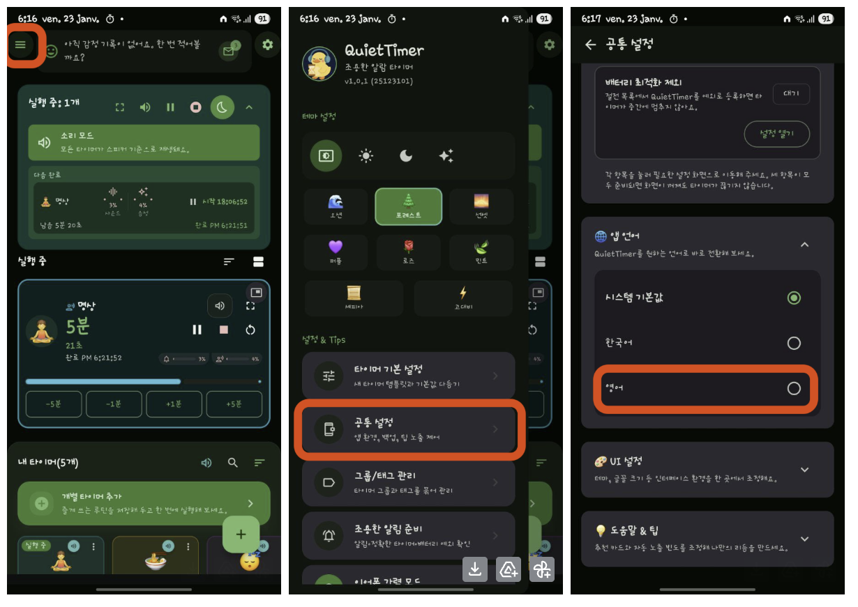Hello,We apologize for the inconvenience.There was an issue where the default language was set to Korean.We plan to change the default language to English in the next update. (It will be updated within a week.) For now, you can change the app language by tapping the menu at the top left of the timer screen.The location of General Settings(공통 설정) in the drawer may vary slightly, but you can find ..