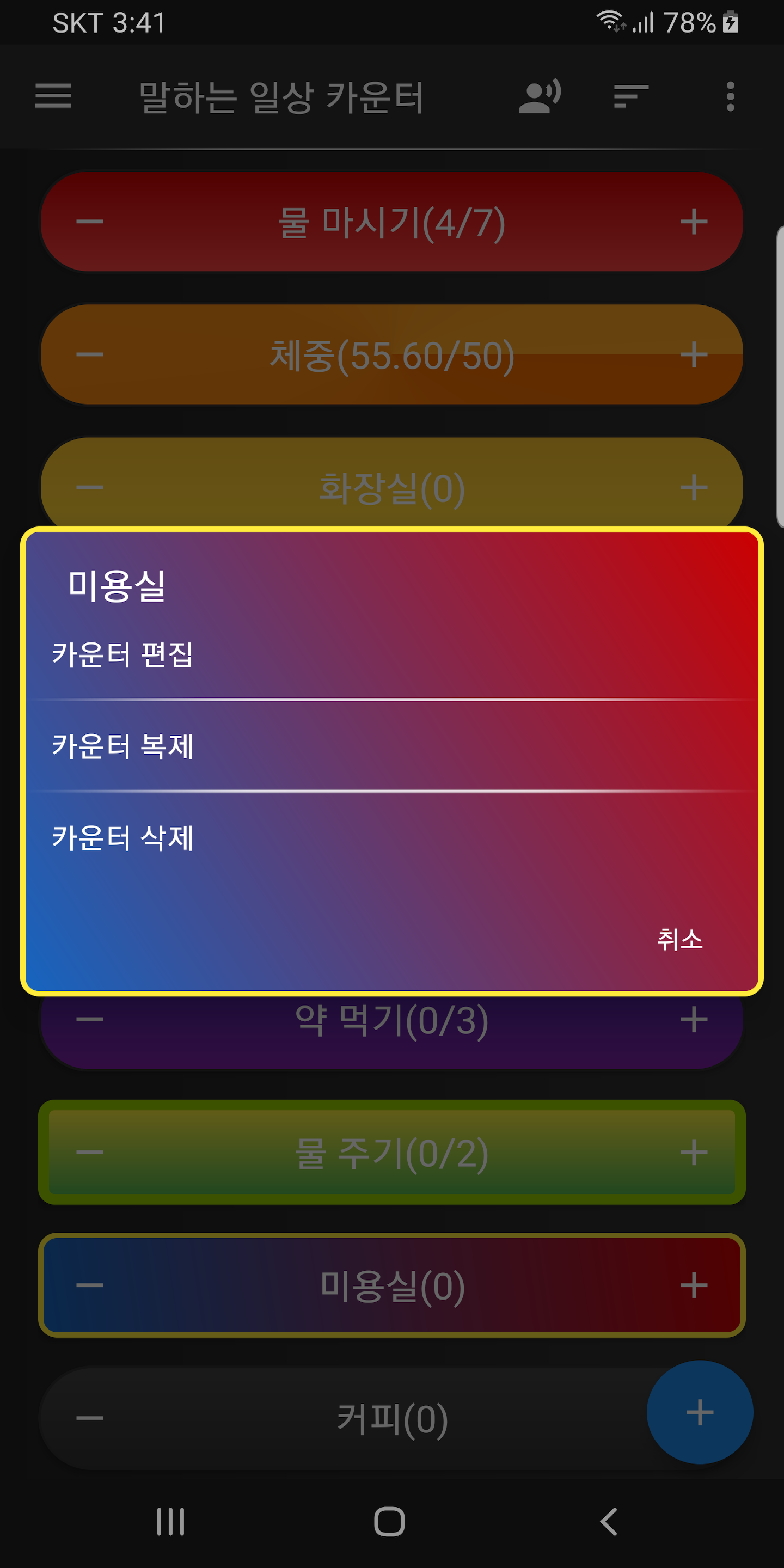 물 마시기, 몸무게, 습관 등 일상의 모든 것을 세고 기록할 수 있습니다. 개별 카운터의 모양을 직접 디자인하고, 목푯값도 설정해보세요!