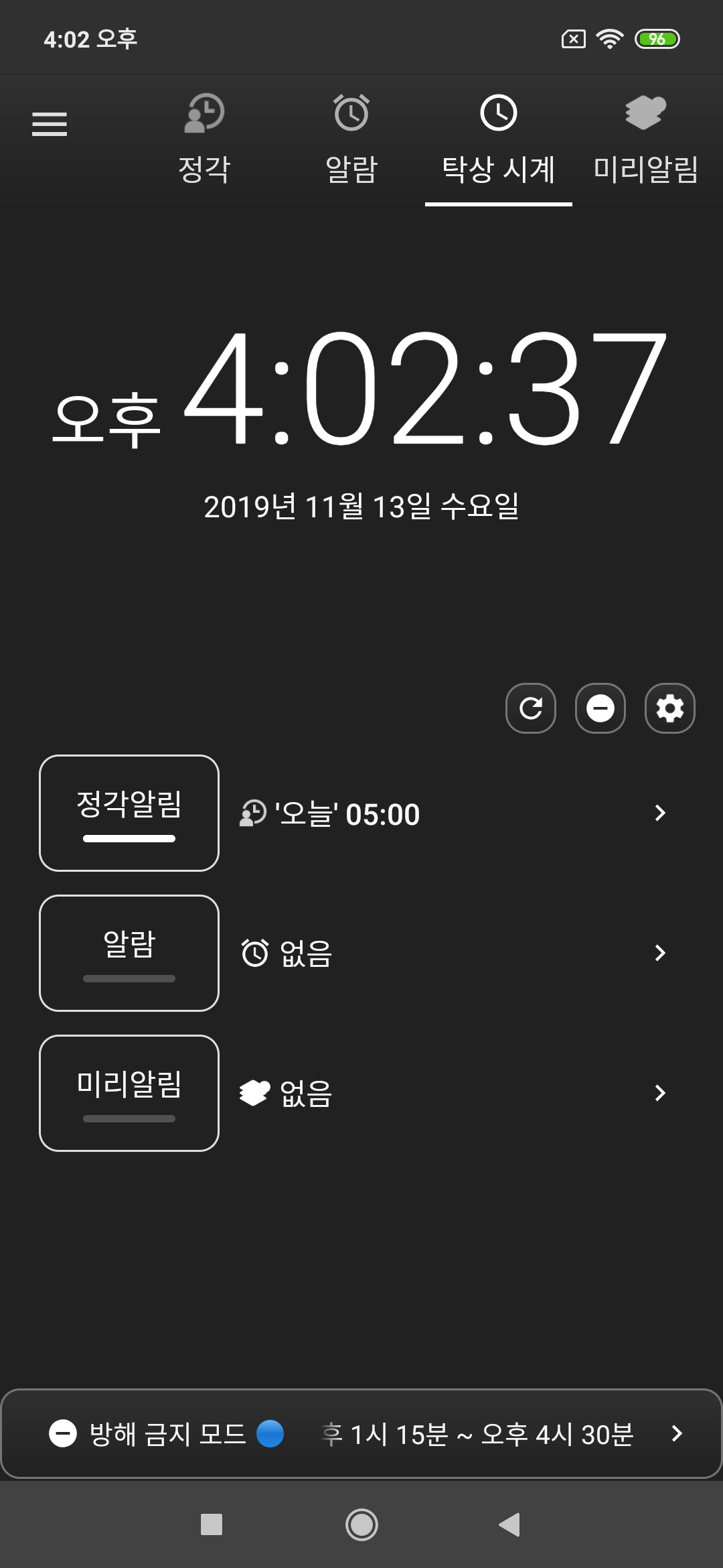 항상 방해금지를 켜면 항상 알람, 정각알림, 미리 알림이 울리지 않습니다.