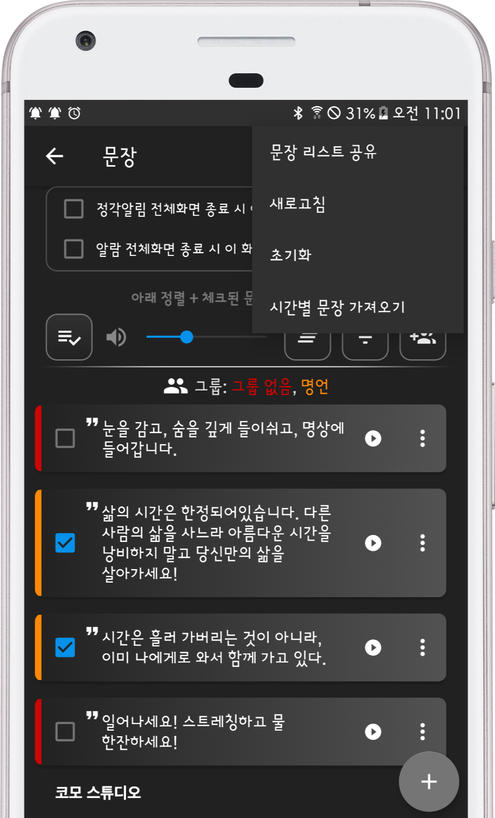사람 모양 아이콘을 누르면 언제든지 그룹 별로, 체크된 문장을 음성으로 브리핑 합니다.