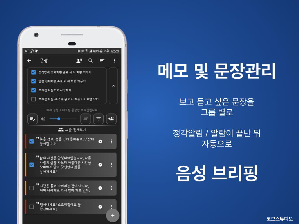 정각알림, 알람 후에 체크된 문장을 자동으로 브리핑 할 수도 있습니다.
