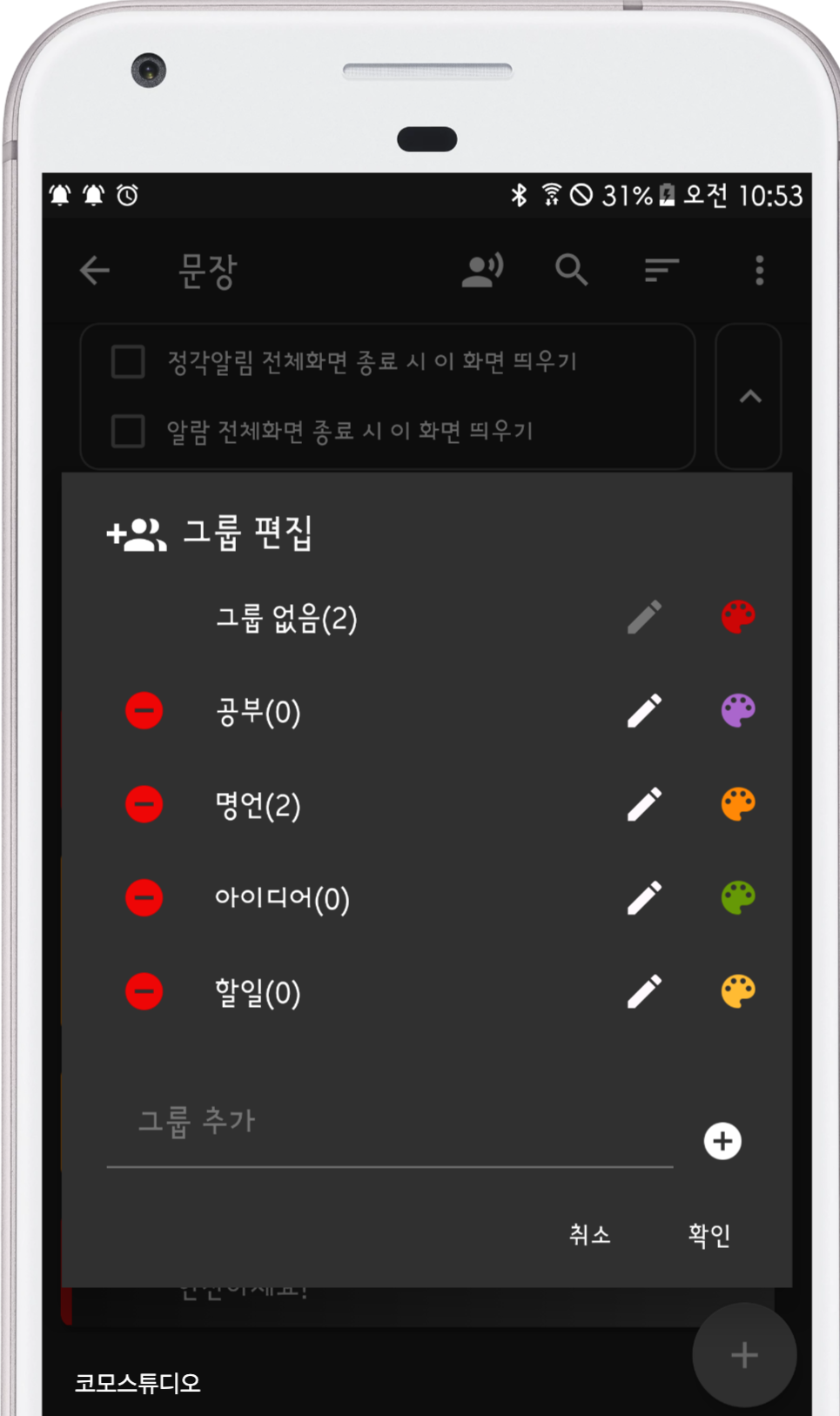 명언, 할일, 공부, 아이디어등으로 원하는 그룹을 만들고 문장 및 메모를 작성 해보세요.