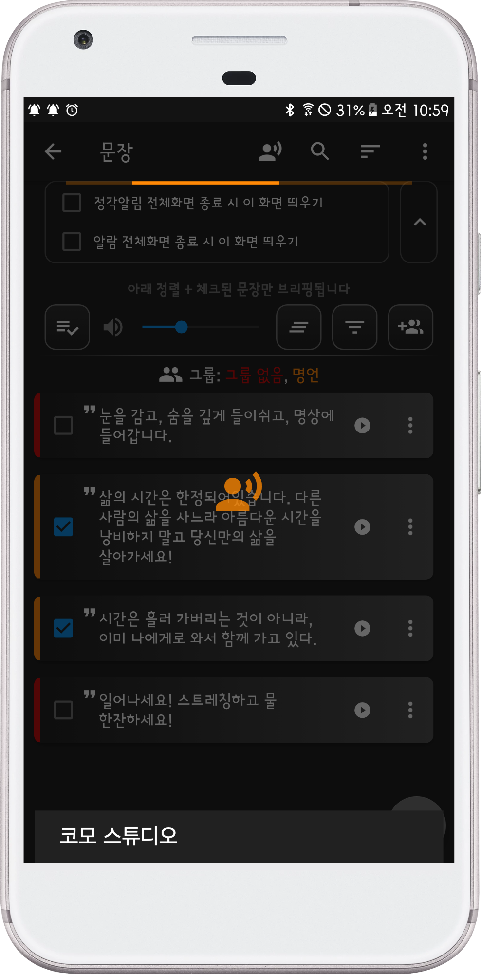 사람 모양 아이콘을 누르면 언제든지 그룹 별로, 체크된 문장을 음성으로 브리핑 합니다.