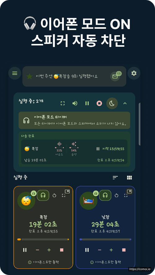 • 이어폰이 없으면 → 조용히 타이머만 진행되며 스피커 재생 없음