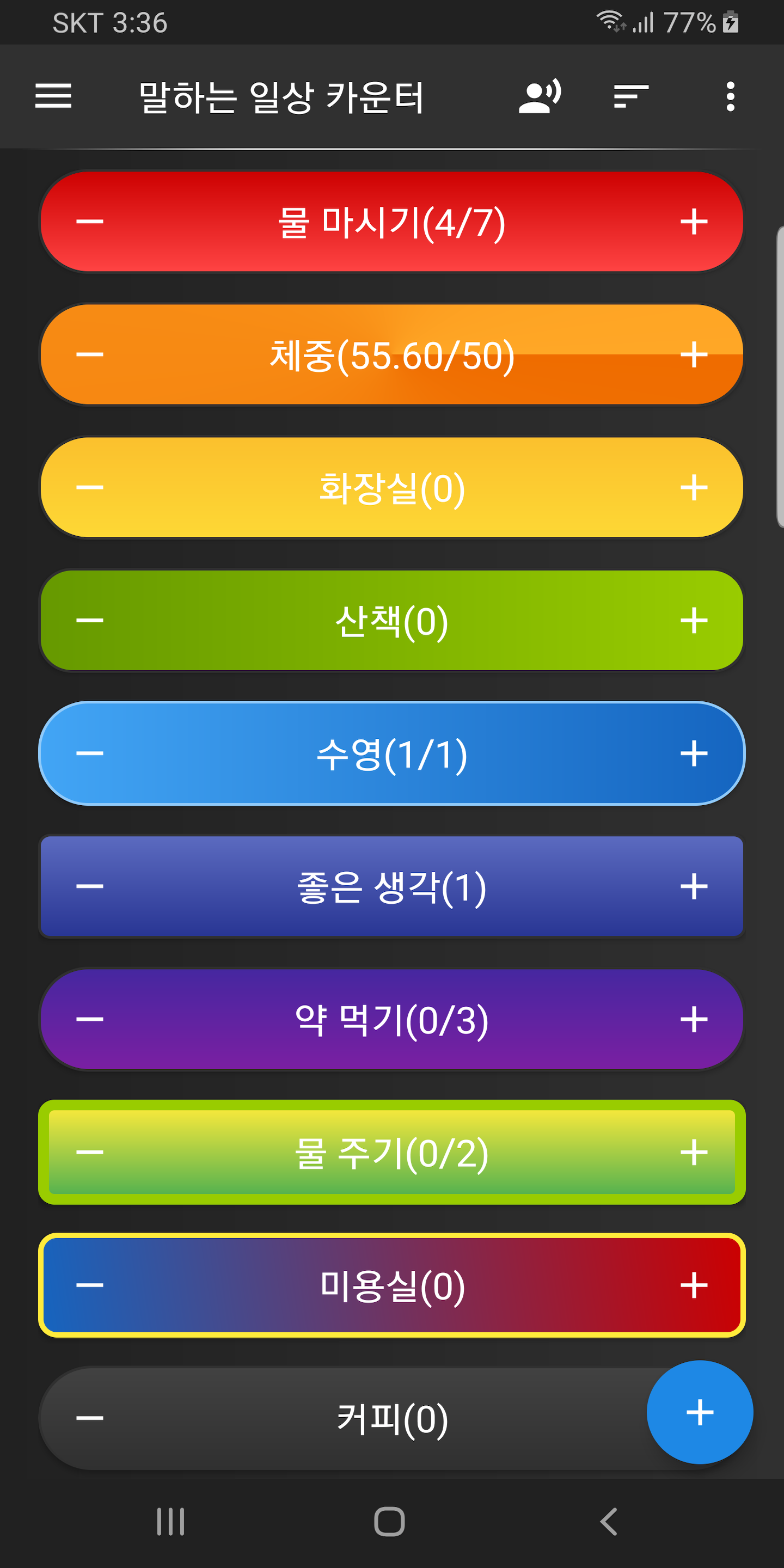 물 마시기, 몸무게, 습관 등 일상의 모든 것을 세고 기록할 수 있습니다. 개별 카운터의 모양을 직접 디자인하고, 목푯값도 설정해보세요! 구글 플레이에서 무료 다운로드 https://play.google.com/store/apps/details?id=com.comostudio.counter 물 마시기, 카운팅, 운동, 몸무게(소수점), 재고, 낚시(물고기 세기), 수영, 물 주기(식물/반려견 묘), 습관, 약 먹기, 미용실, 방귀, 배변, 소변, 외국어(영어, 한자, 일어 등) 숫자 공부, 스트레칭, 눈 깜박임, 먹이 주기, 간식, 음료, 게임 점수, 나쁜 말, 좋은 말 횟수, 좋은 생각, 나쁜 생각, 칼로리, 디데이, 다이어트, 날짜, 기도 등 모든 것을 셀 수(계수기) 있습니다. 개별 카운터의 모양(..