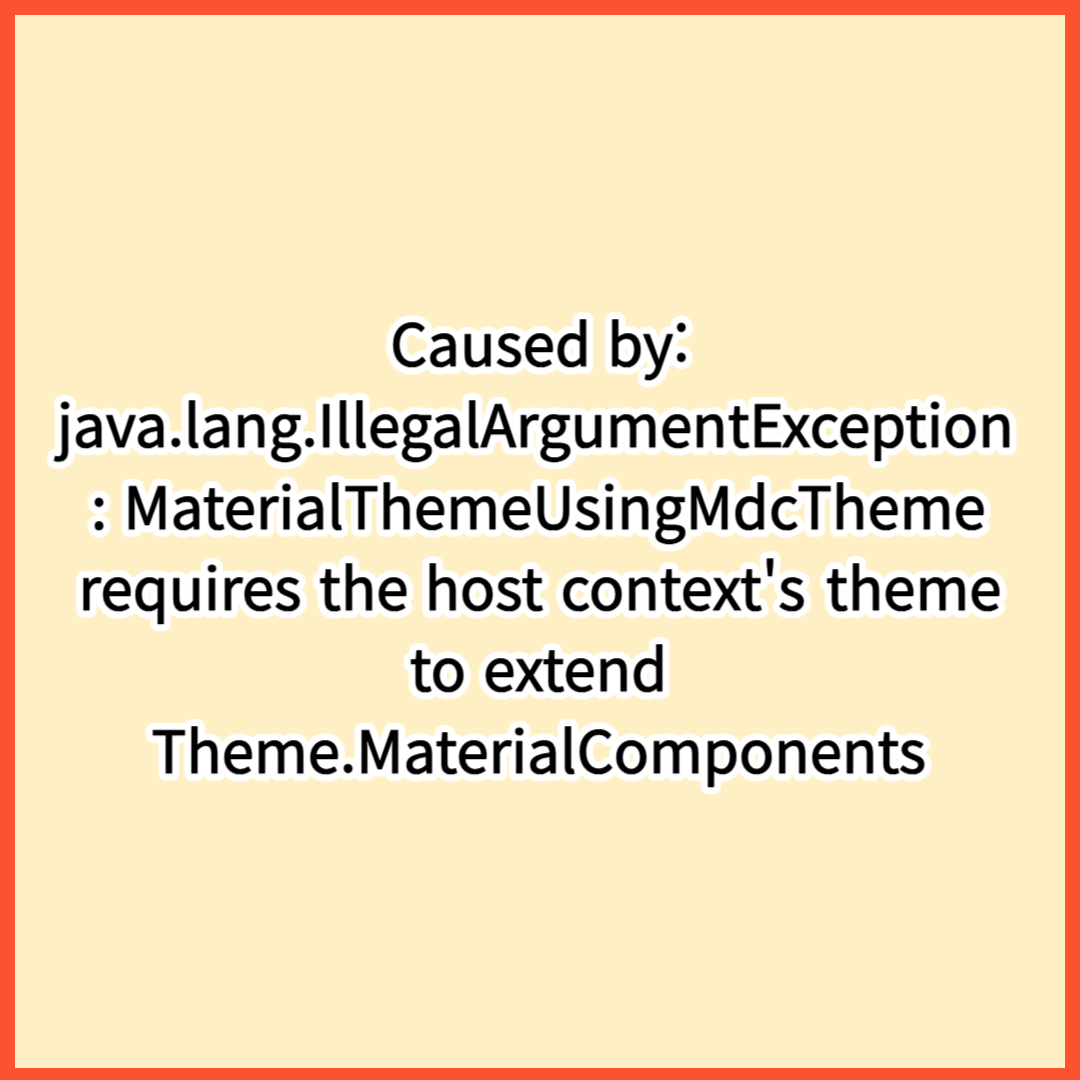 Caused by: java.lang.IllegalArgumentException: MaterialThemeUsingMdcTheme requires the host context's theme to extend Theme.MaterialComponents at com.google.android.material.composethemeadapter.MdcTheme.createMdcTheme(MdcTheme.kt:134) at com.google.android.material.composethemeadapter.MdcTheme.createMdcTheme$default(MdcTheme.kt:125) at com.google.android.material.composethemeadapter.MdcTheme.Mdc..
